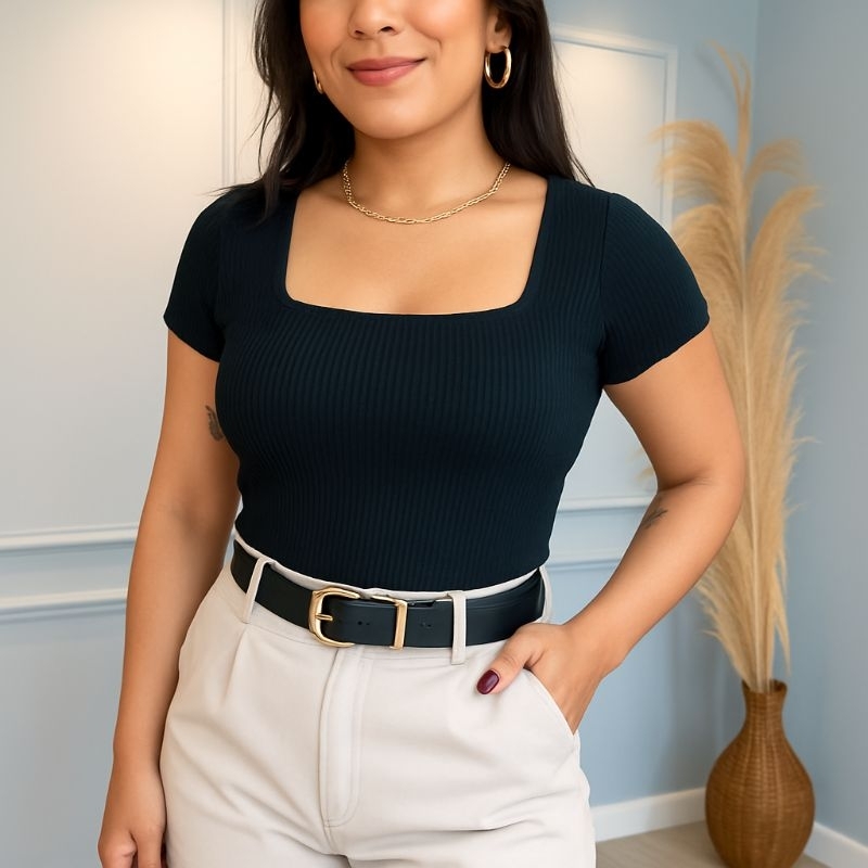 Blusa/Cropped Feminina Decote Quadrado Blusinha Canelada Básica Manga Curta Trabalho Elegante Dia a Dia