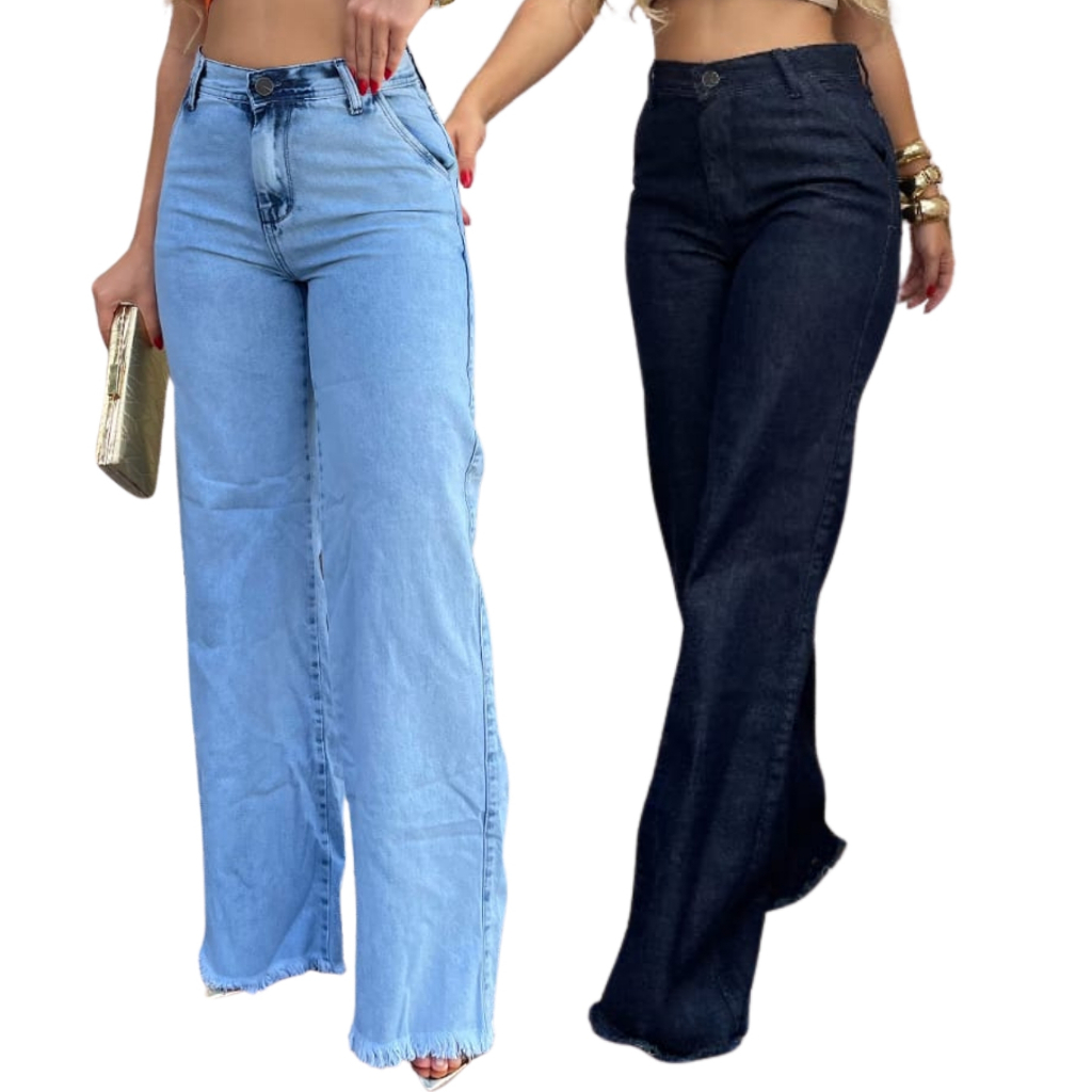 Kit 02 calças Wide Leg jeans feminina na cor clara e escura cintura alta 100% algodão Premium