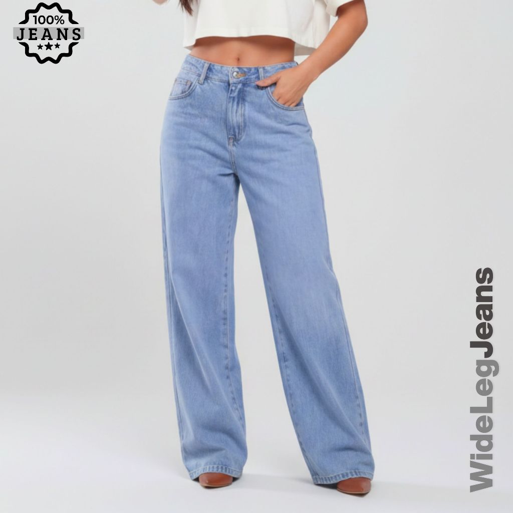 Calça Jeans Wide Leg Feminina Cintura Alta Pantalona Premium Jeans Grosso 100% Algodão Levanta Bumbum Moda 2026