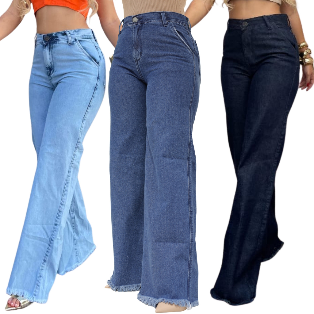 Kit Calça Feminina Jeans Wide Leg 100% Algodão Cintura Alta Premium Marmorizada Pantalona Perna Larga Cós Alto