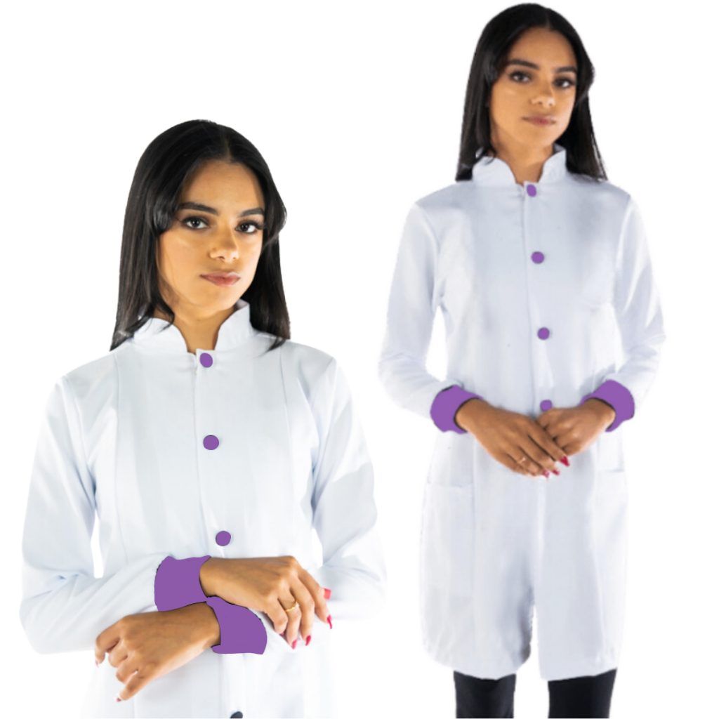 FAQ: Jaleco Feminino Acinturado Oxford Branco com Punho e Botão Lilás