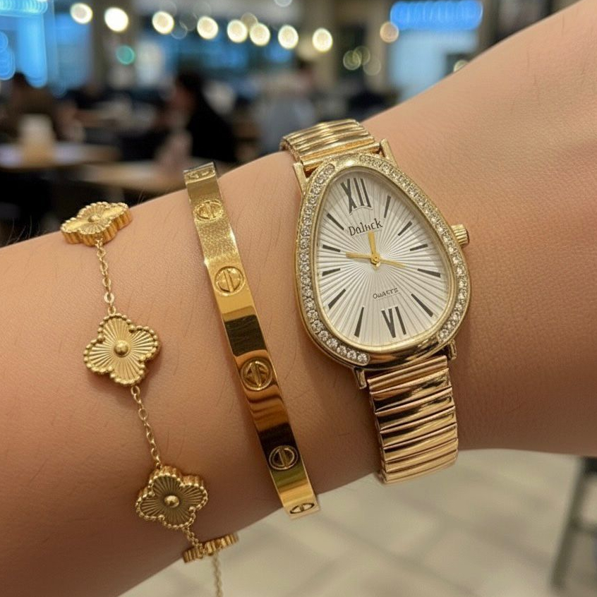Receba Kit Conjunto Relógio Feminino Dourado com Pulseira Pulseira Acessórios Femininos Relógio no seu celular!