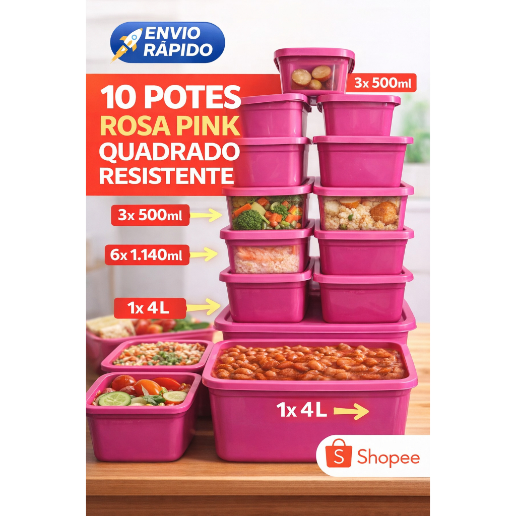 Kit 10 Potes Rosa Pink Quadrado Resistente Vai ao Micro-ondas e Freezer Organização Cozinha