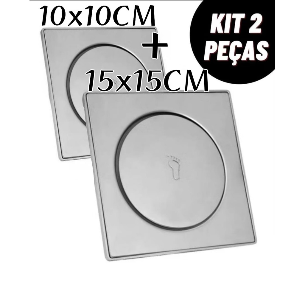 Kit 2 Ralos Inteligentes Click Quadrado Prata 10x10 15x15 Cm Inox Banheiro Lavabo Veda Cheiro