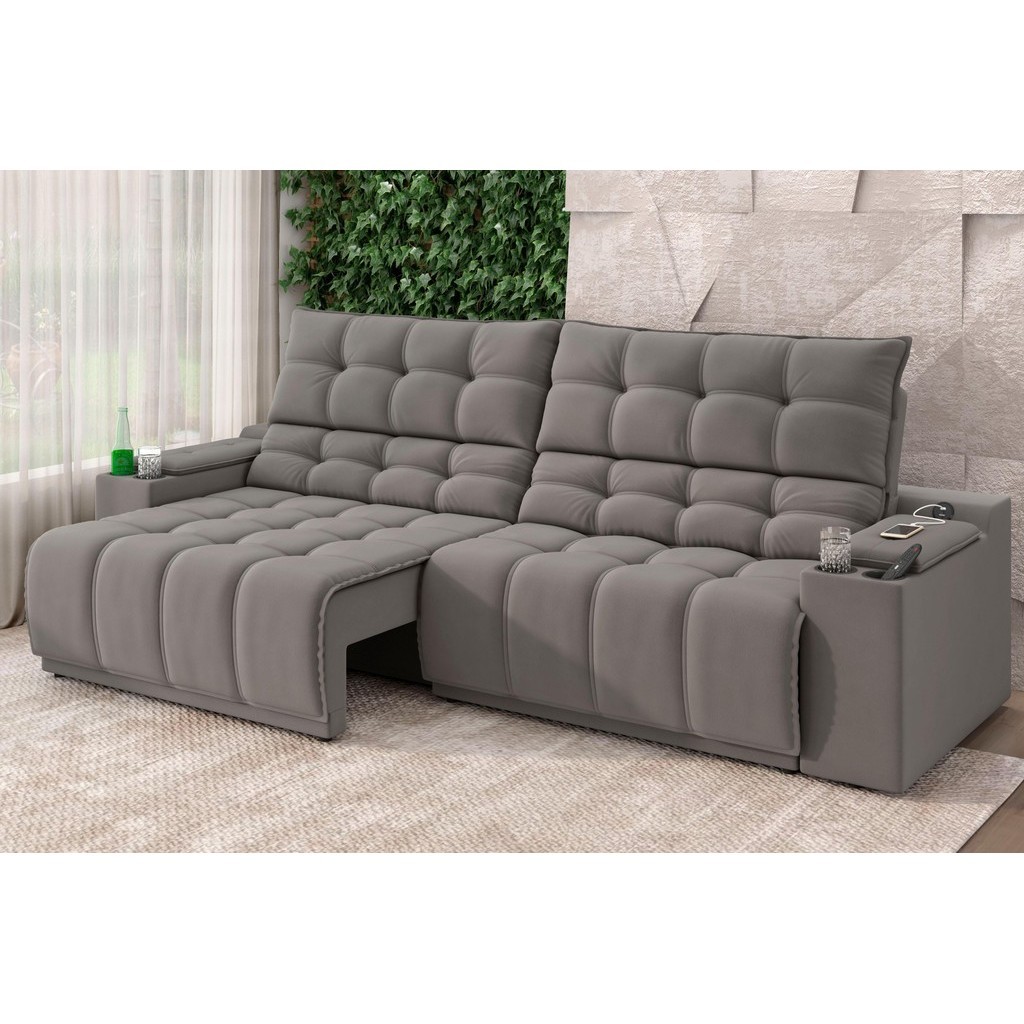 Sofá Connect Premium 2,00m Assento Retrátil/Reclinável com porta copos e entrada USB Suede Cinza