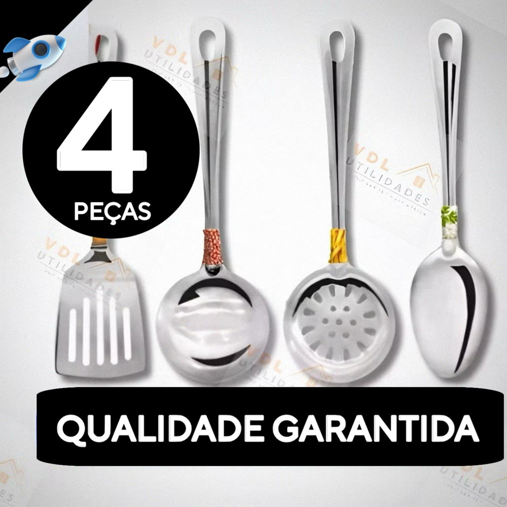 Receba Utensilios para Cozinha INOX 4pçs - Espatula Escumadeira Colher de Arroz Concha Louça Comida Casa no seu celular!