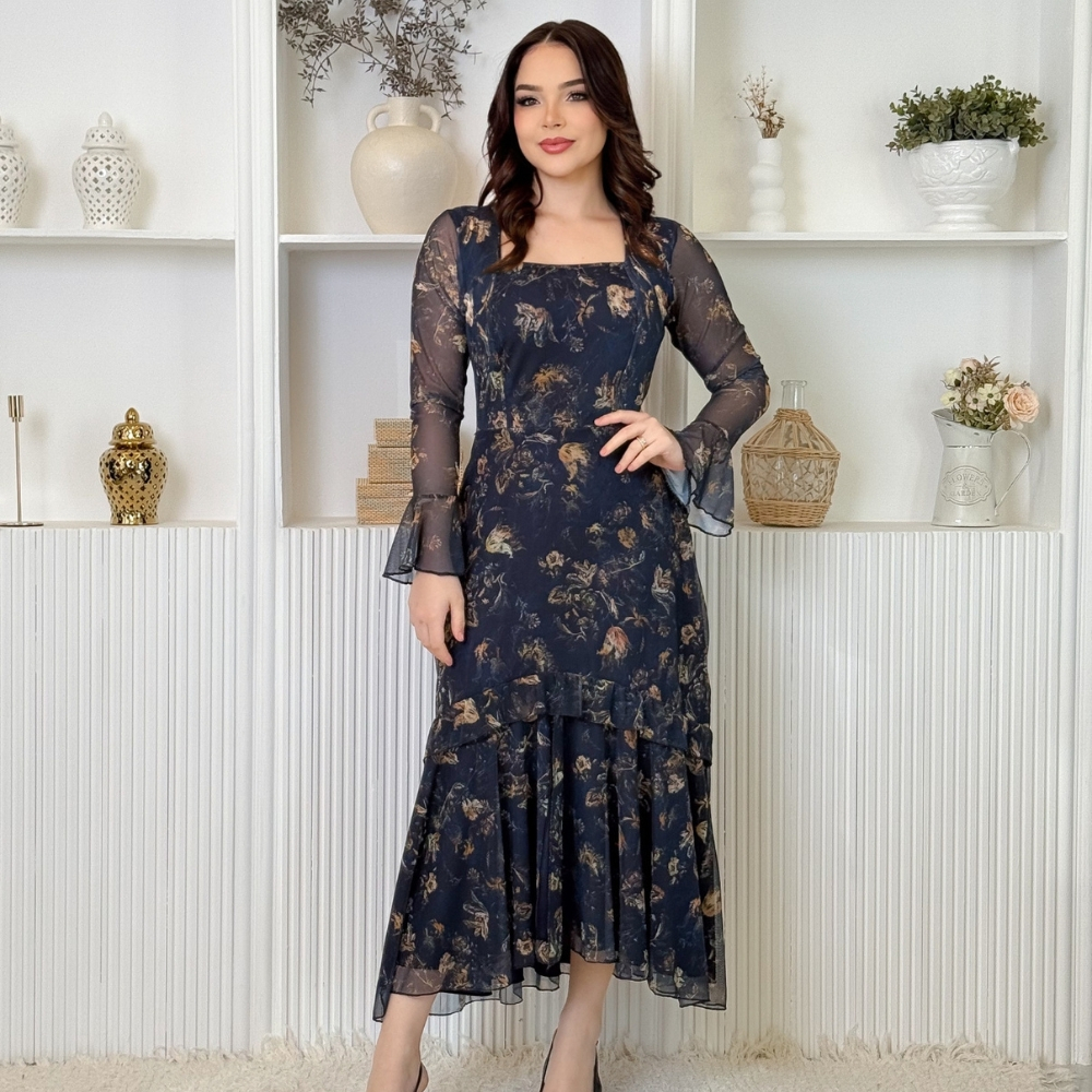 FAQ: Vestido Longo Feminino em Tule Estampado Manga Longa Modelagem Evasê com Babado Várias Estampas